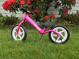 She is starting to learn by walking the bike without sitting on it. I think after a few more times she will learn to sit and push with her feet. She is currently using the smaller seat, but as she gets bigger we will change the seat to the larger padded one with the added carrying handle.