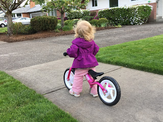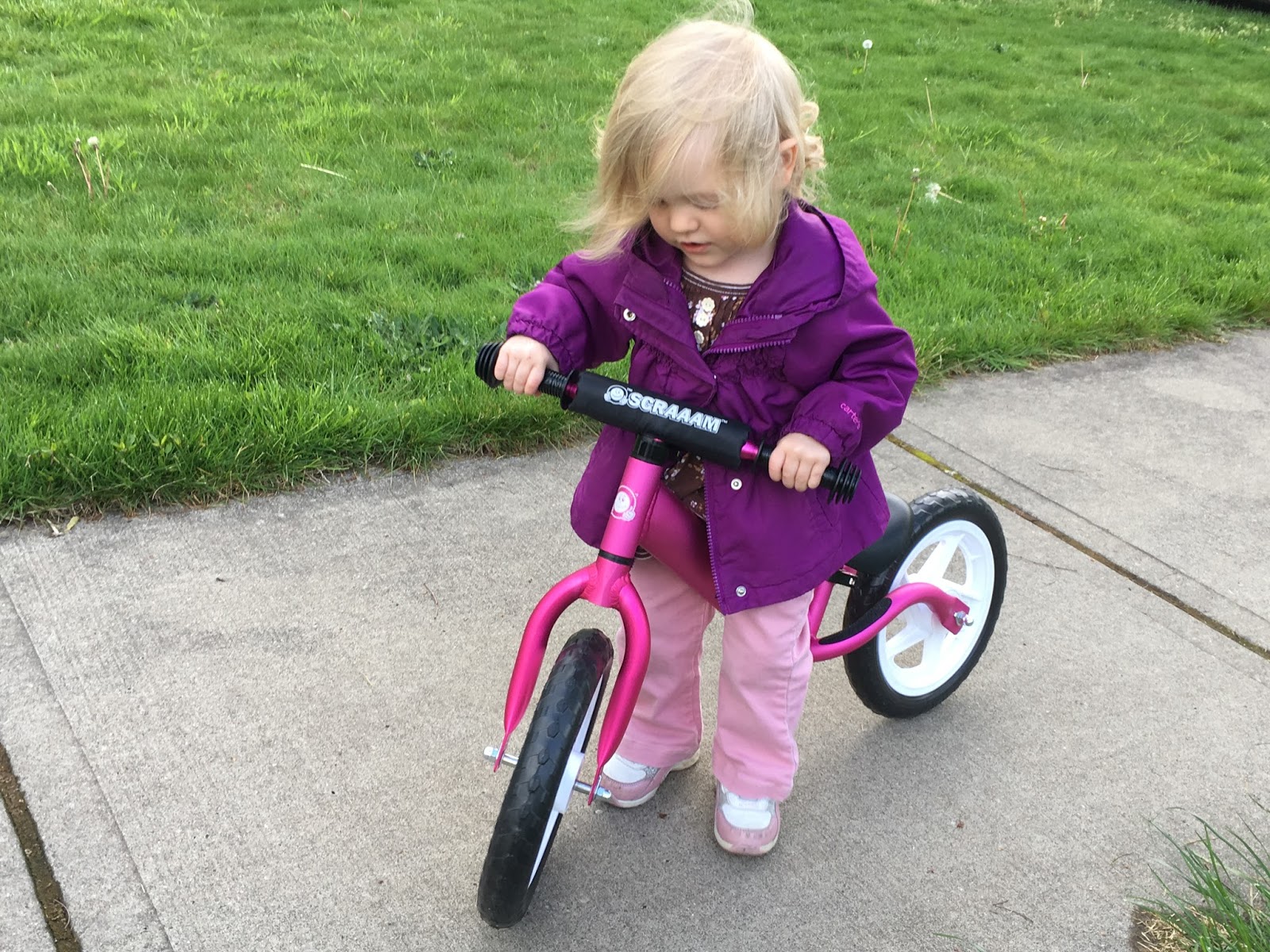 We had gotten another brand of balance bike, but after assembling it and trying to get her on it, the seat was way to high and her feet couldn’t touch the ground. The seat on the SCRAAAM Coaster GT balance bike is able to go as low as 11.5 inches so even though she is only 20 months old she is able to get on and off it easily. Sometimes the bike falls over, but because it is so light she can stand it back up. Also, because it is so light it is easy to carry home when she gets tired of riding.